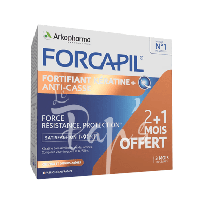 Le complément alimentaire Arkopharma Forcapil participe à la santé globale des cheveux et des ongles en fournissant des minéraux et vitamines essentiels pour leur structure. Il peut être notamment pris en cure lors des changements de saison. Son efficacité a été testée cliniquement pendant 6 mois sur un panel de 40 personnes.
